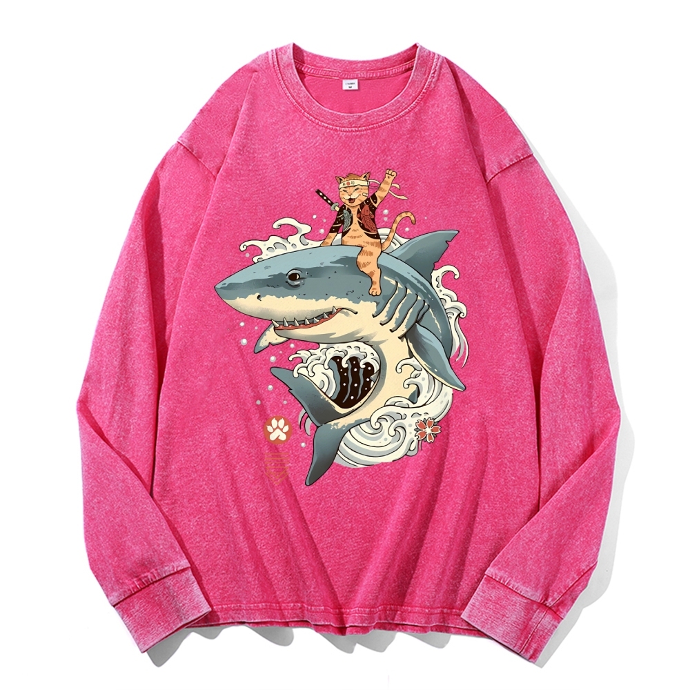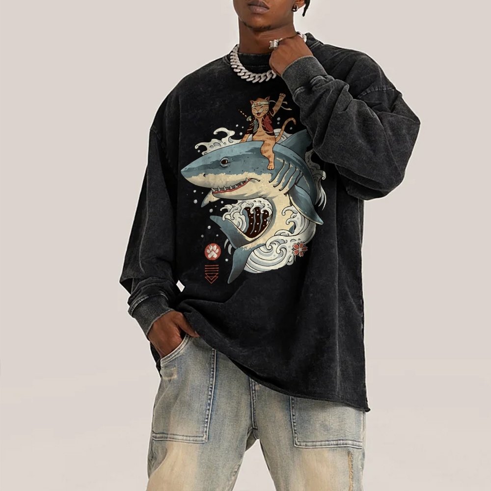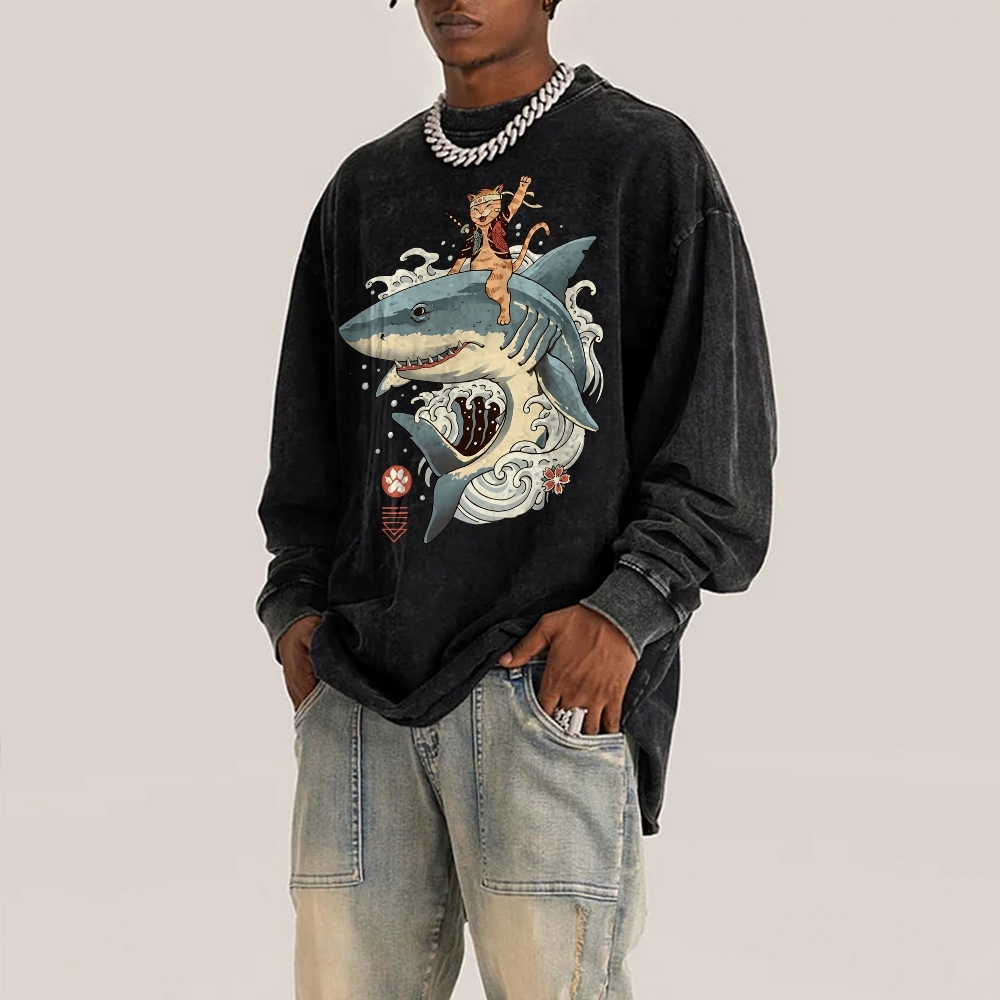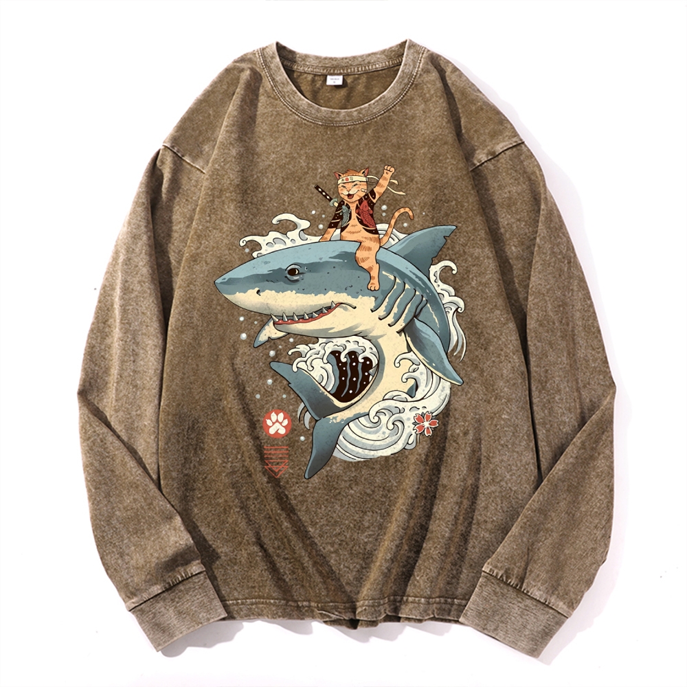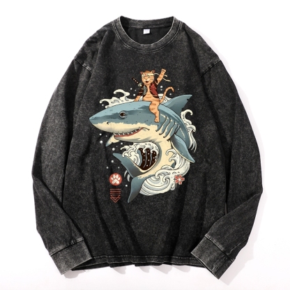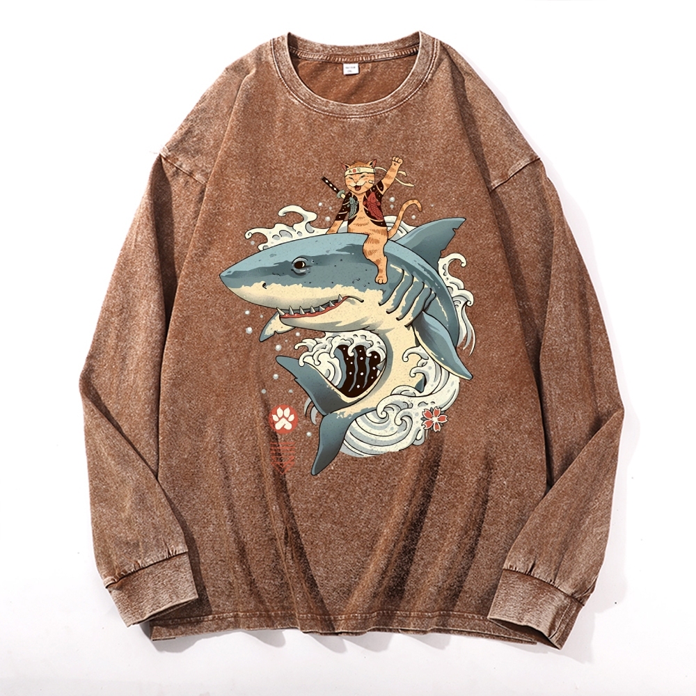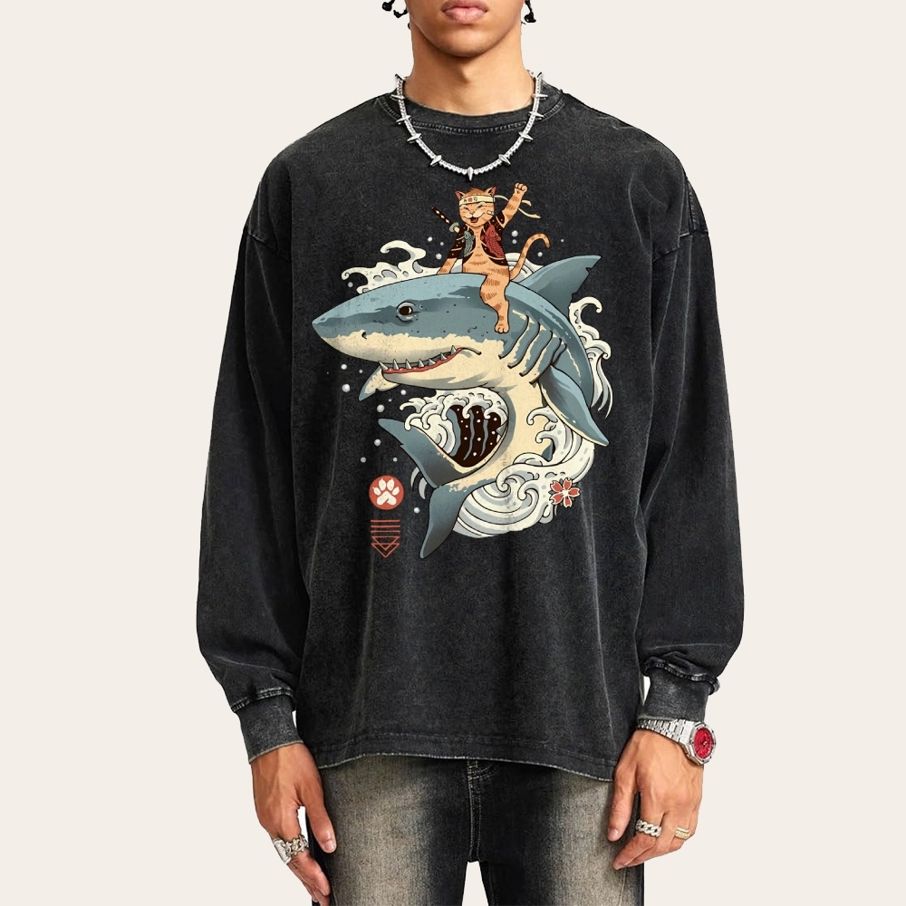 Shark Sushi Cat Ukiyoe Pattern Deep Washed Vintage Long Sleeves T-Shirt