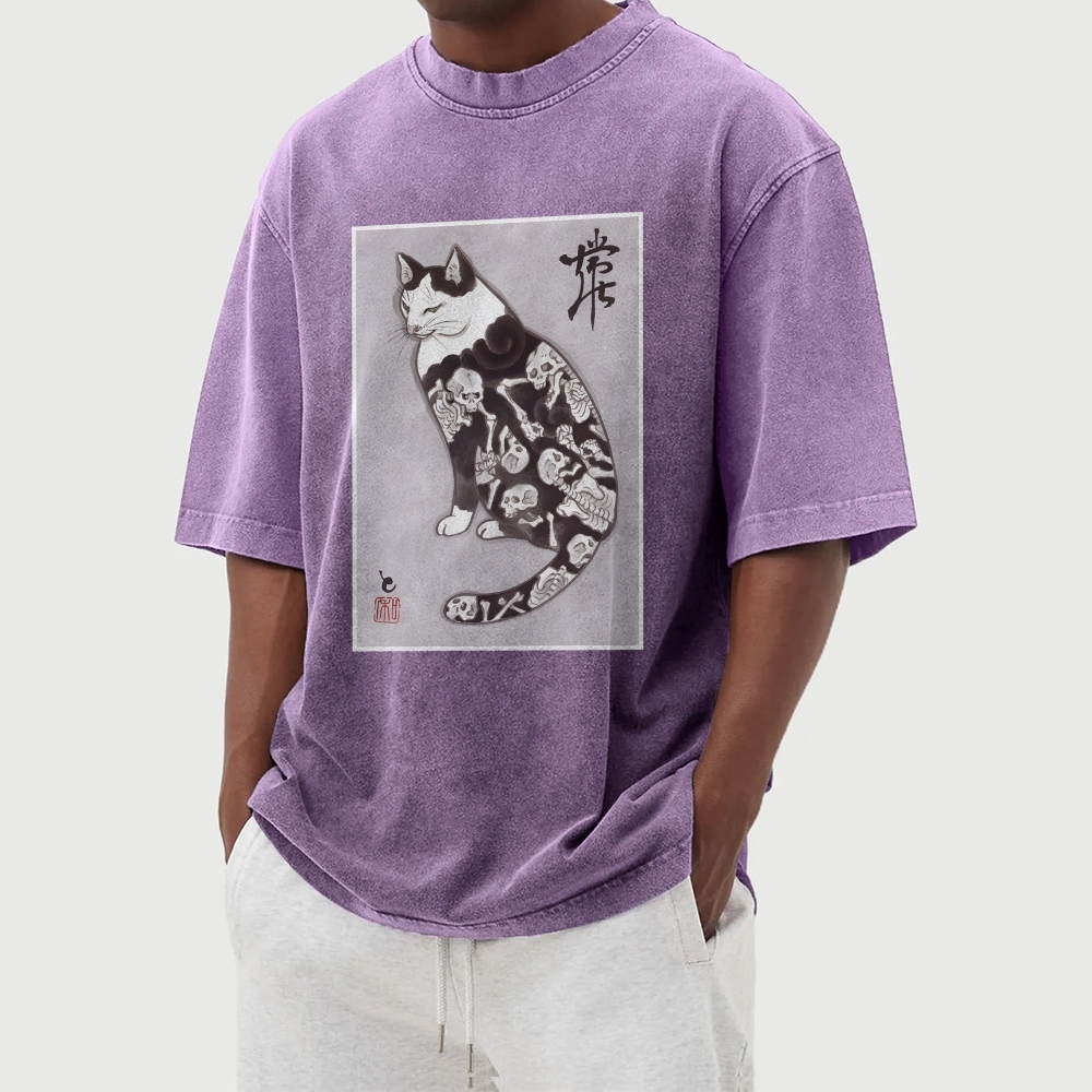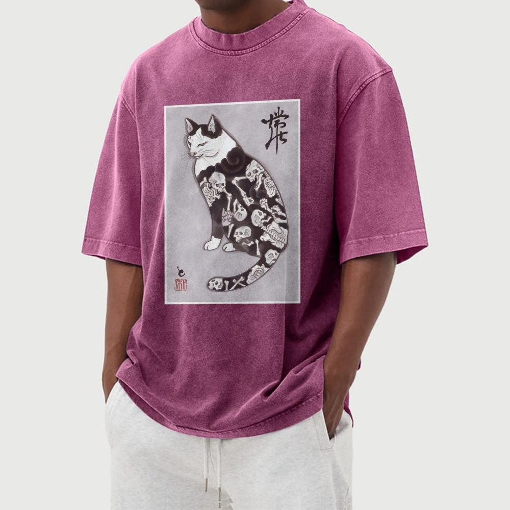 Skull Cat Washed Vintage Short Sleeves T-Shirt