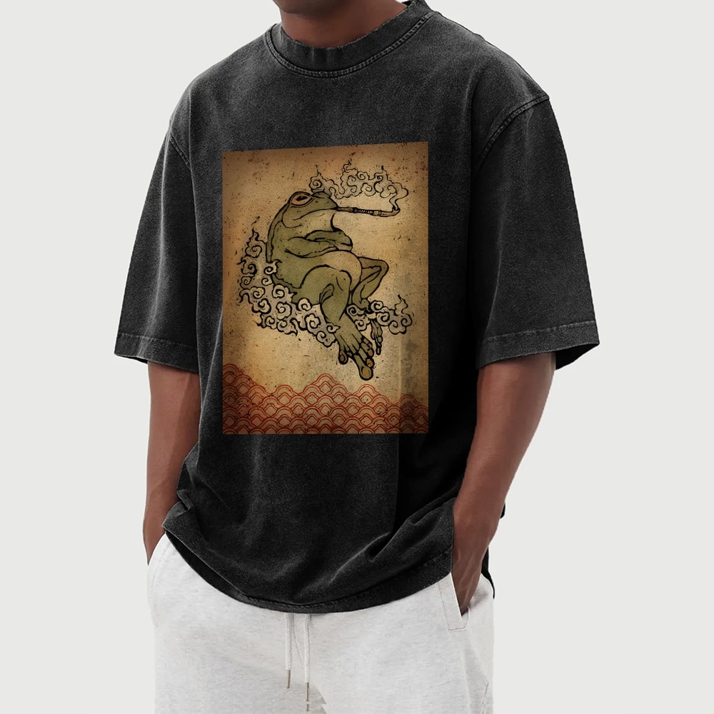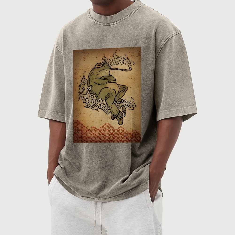 Smoking Frog Pattern Washed Vintage Short Sleeves T-Shirt