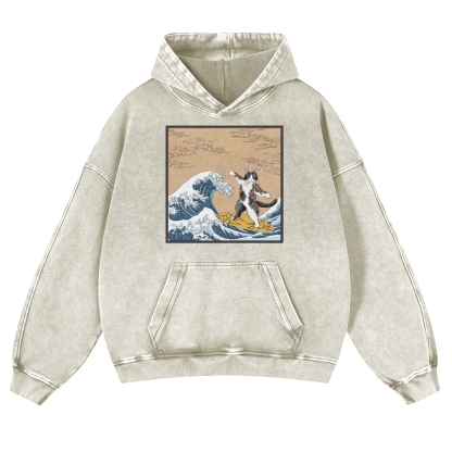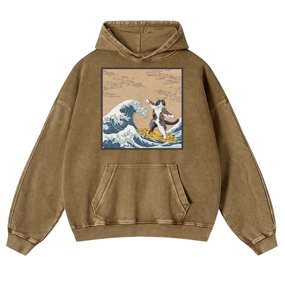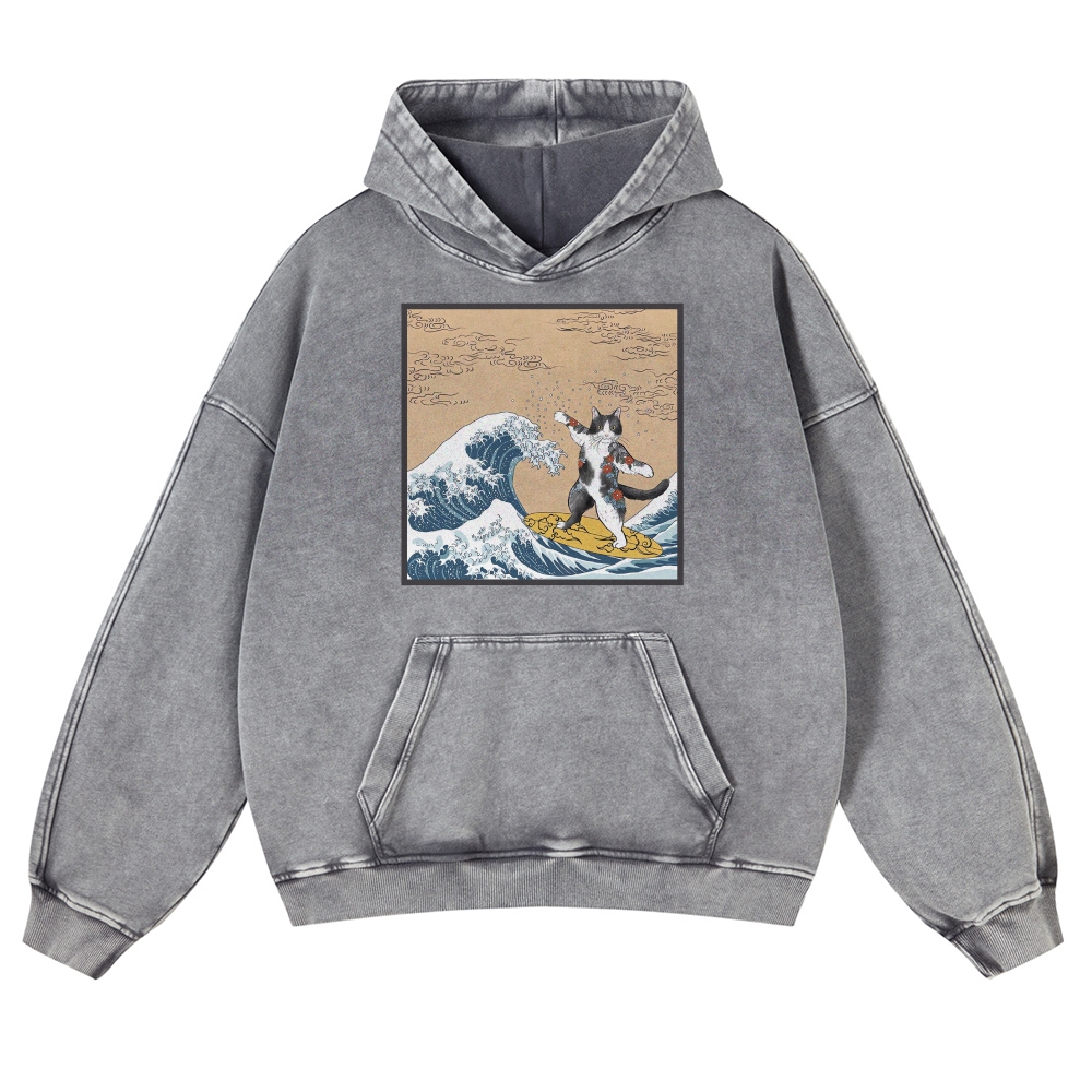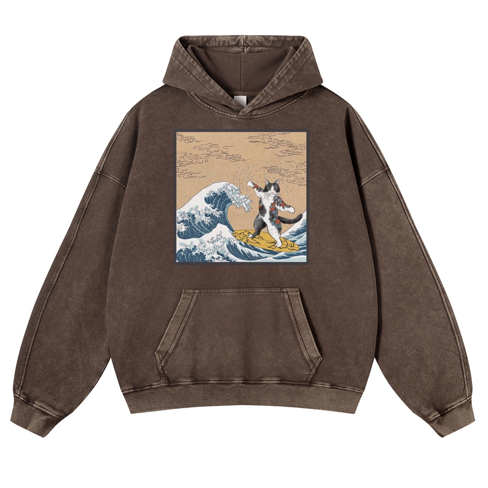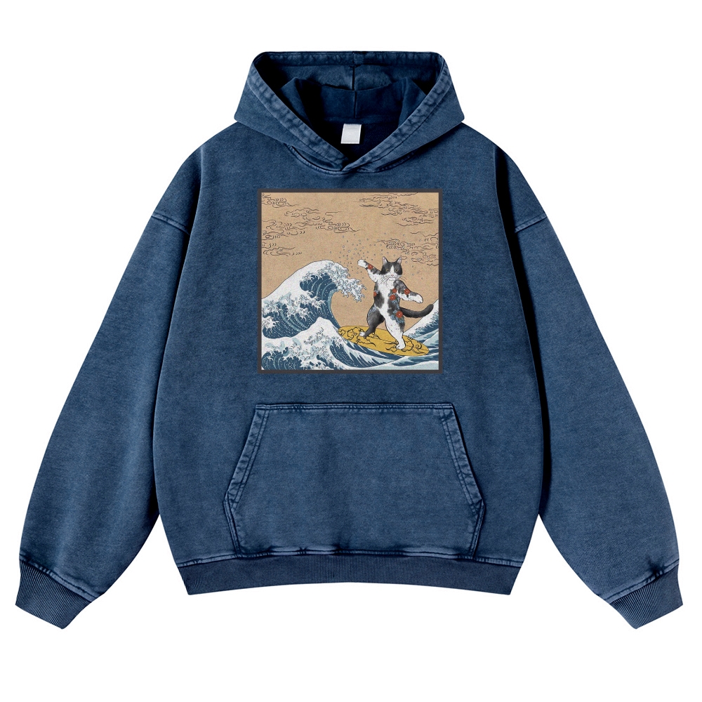 Surf-Bored Cat Ukiyoe Pattern Vintage Washed Hoodie