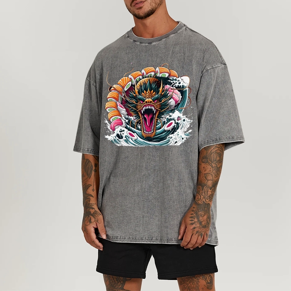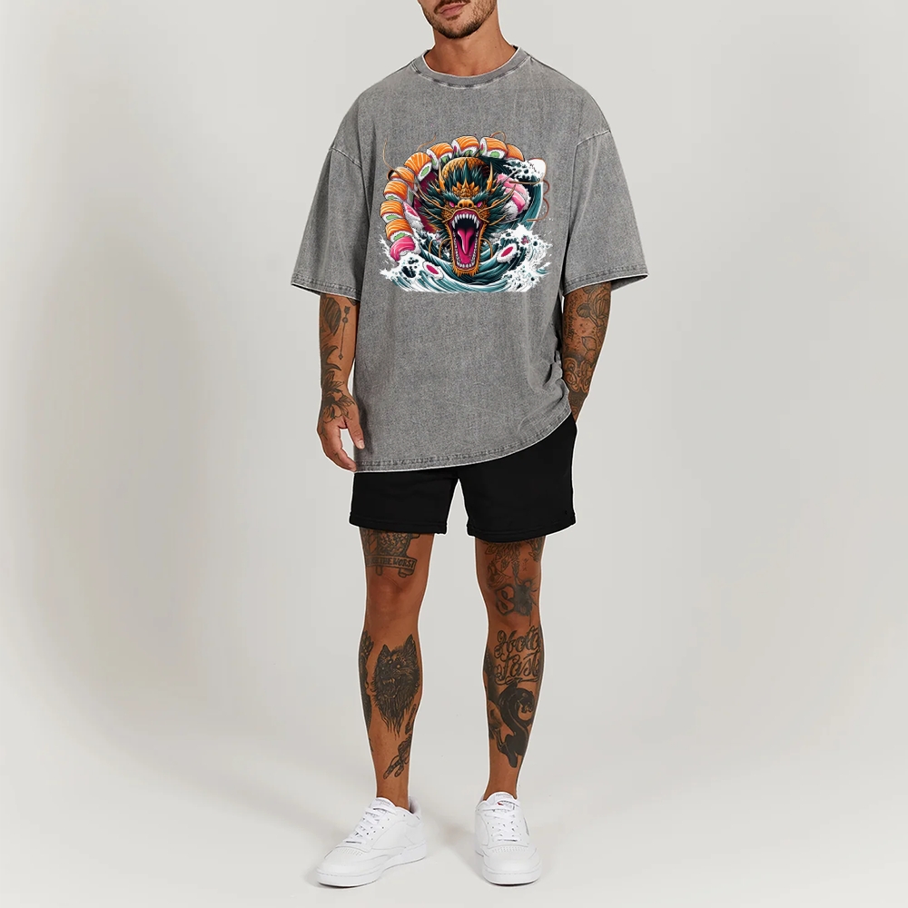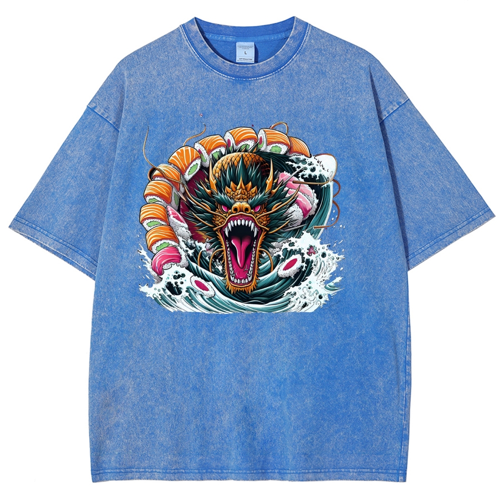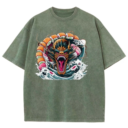 Sushi Dragon Printed Washed Vintage Short Sleeves T-Shirt