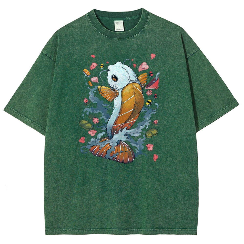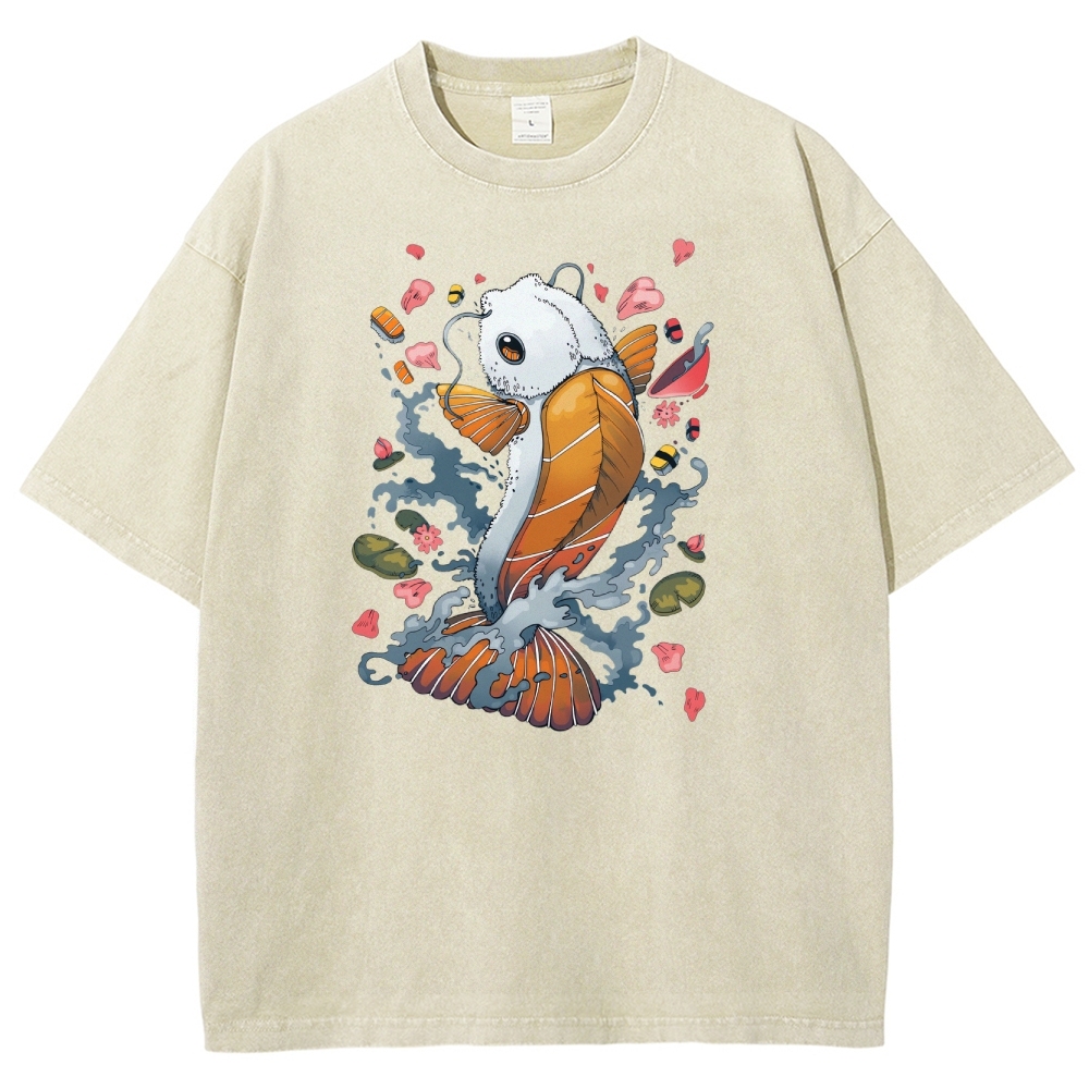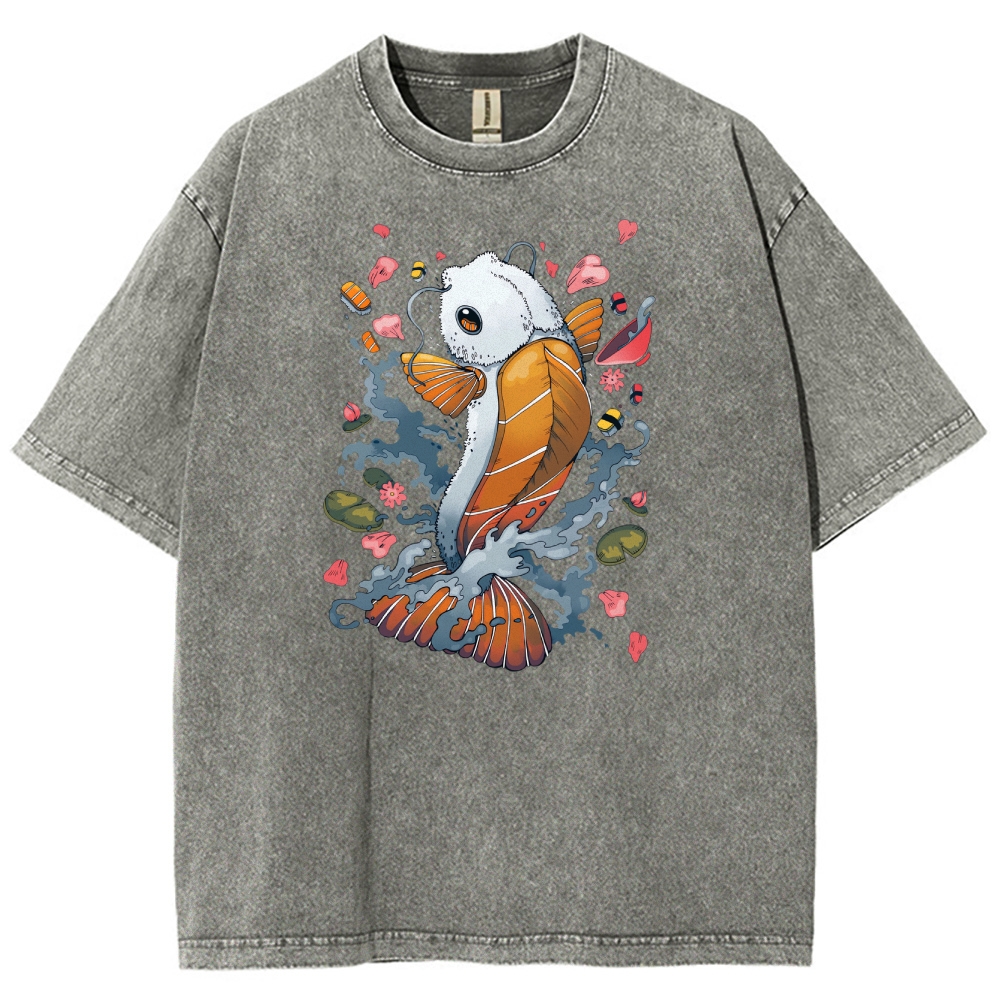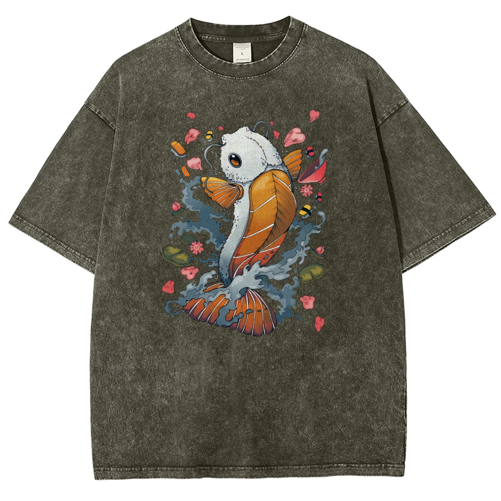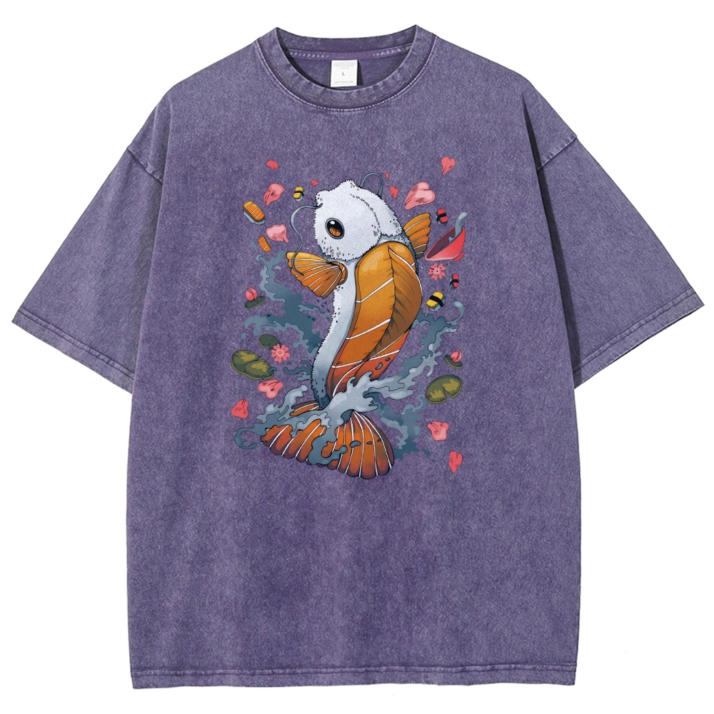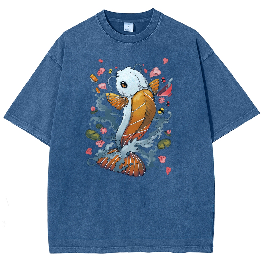 Sushi Fish Printed Washed Vintage Short Sleeves T-Shirt