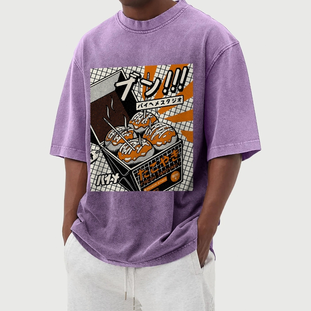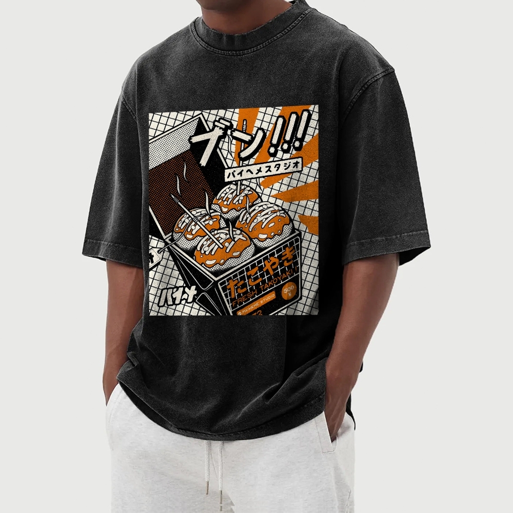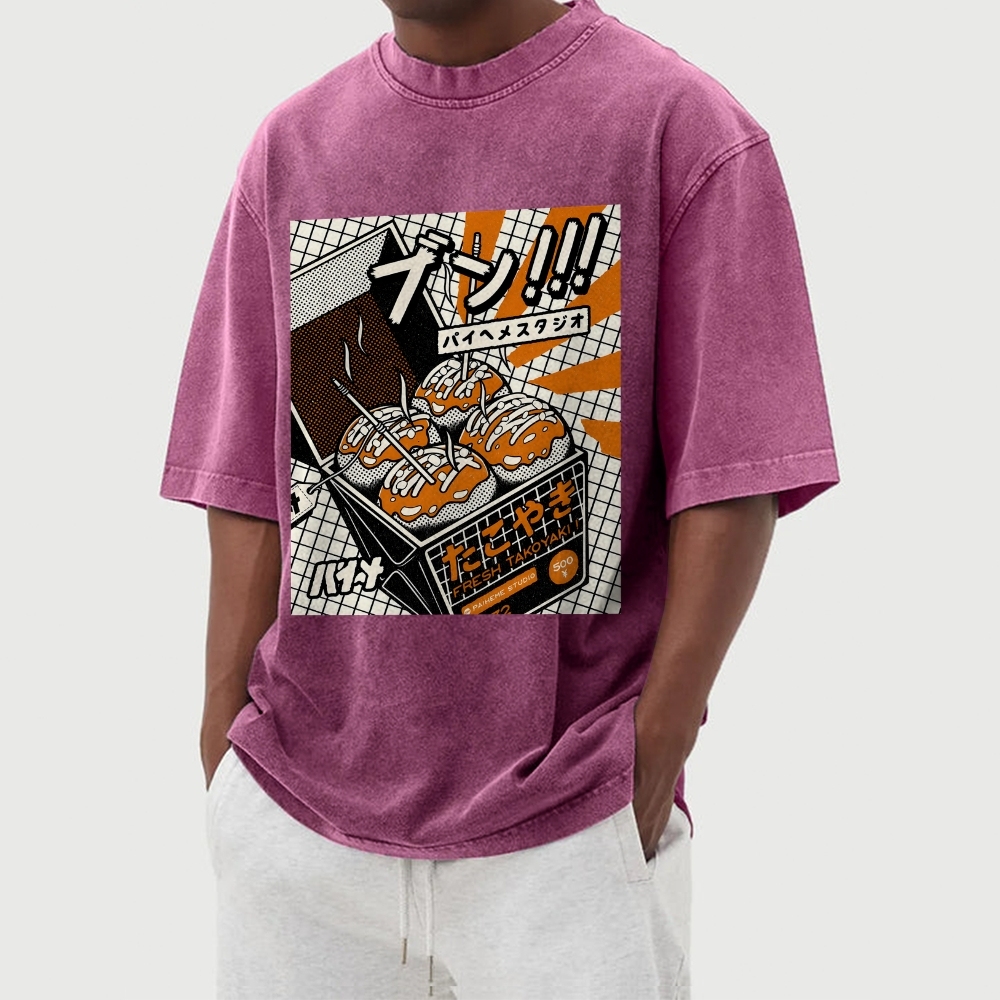 Takoyaki Pattern Washed Vintage Short Sleeves T-Shirt