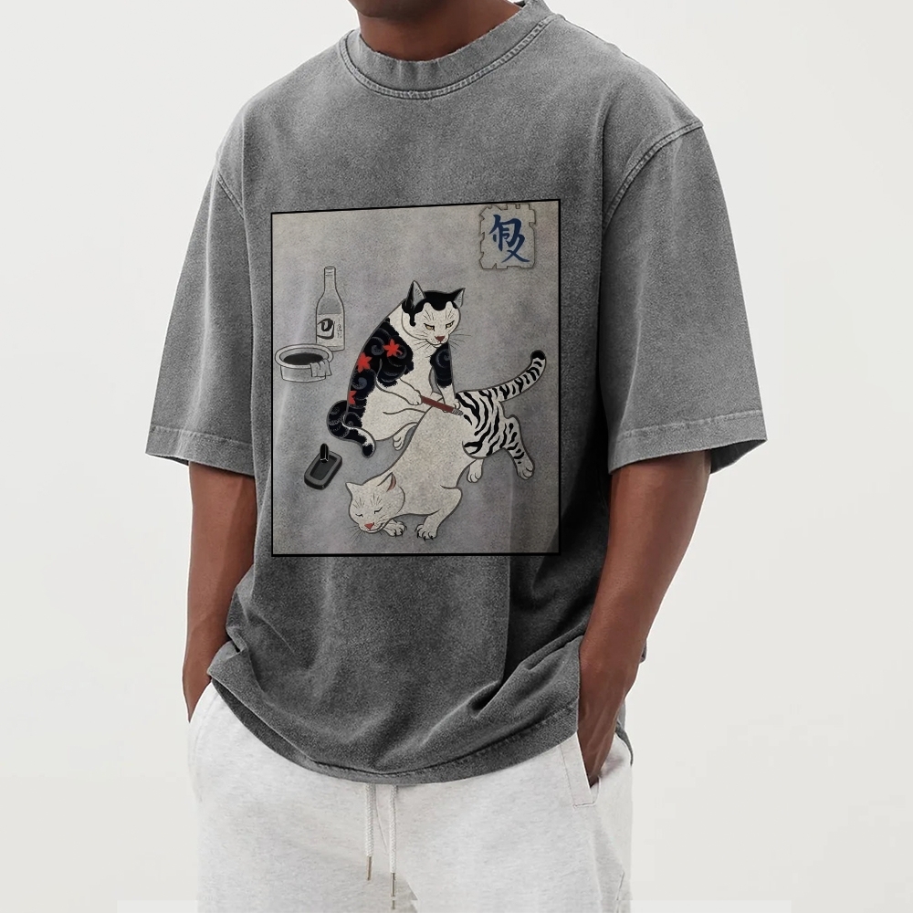 Tattoo Cat Washed Vintage Short Sleeves T-Shirt