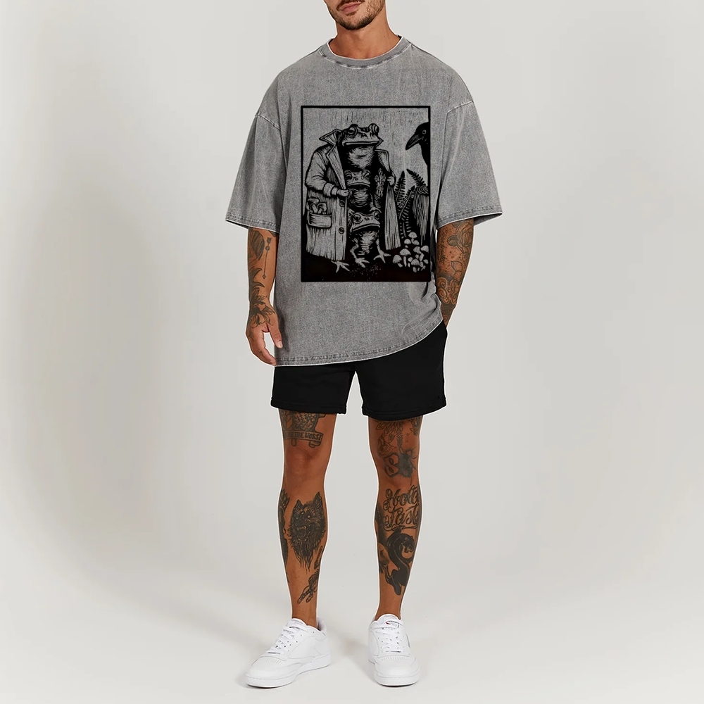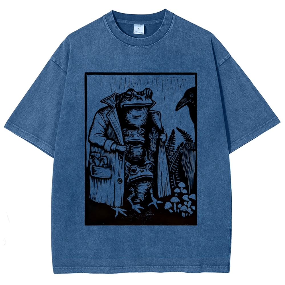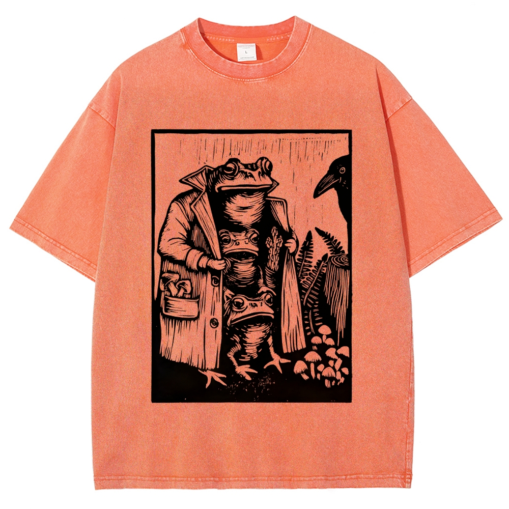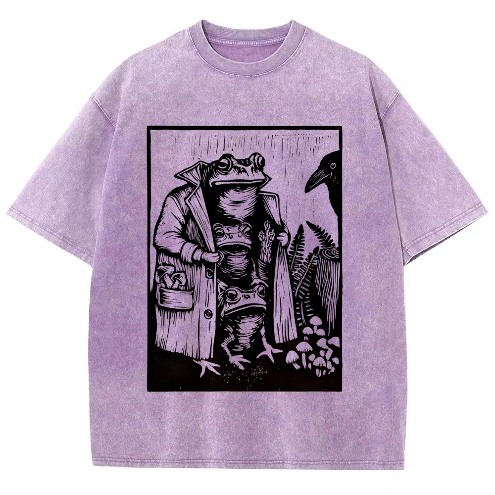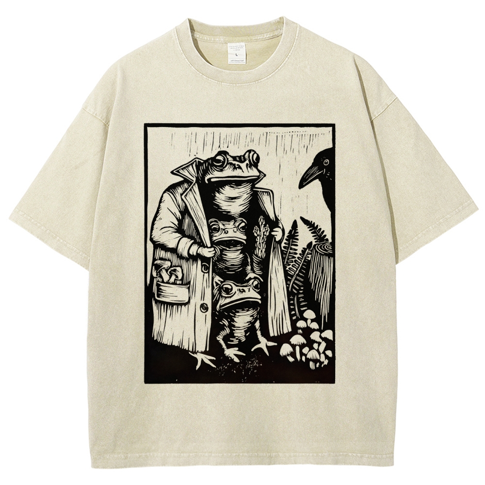 Three Frogs Pattern Washed Vintage Short Sleeves T-Shirt