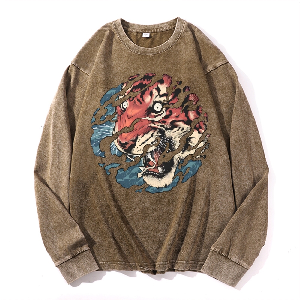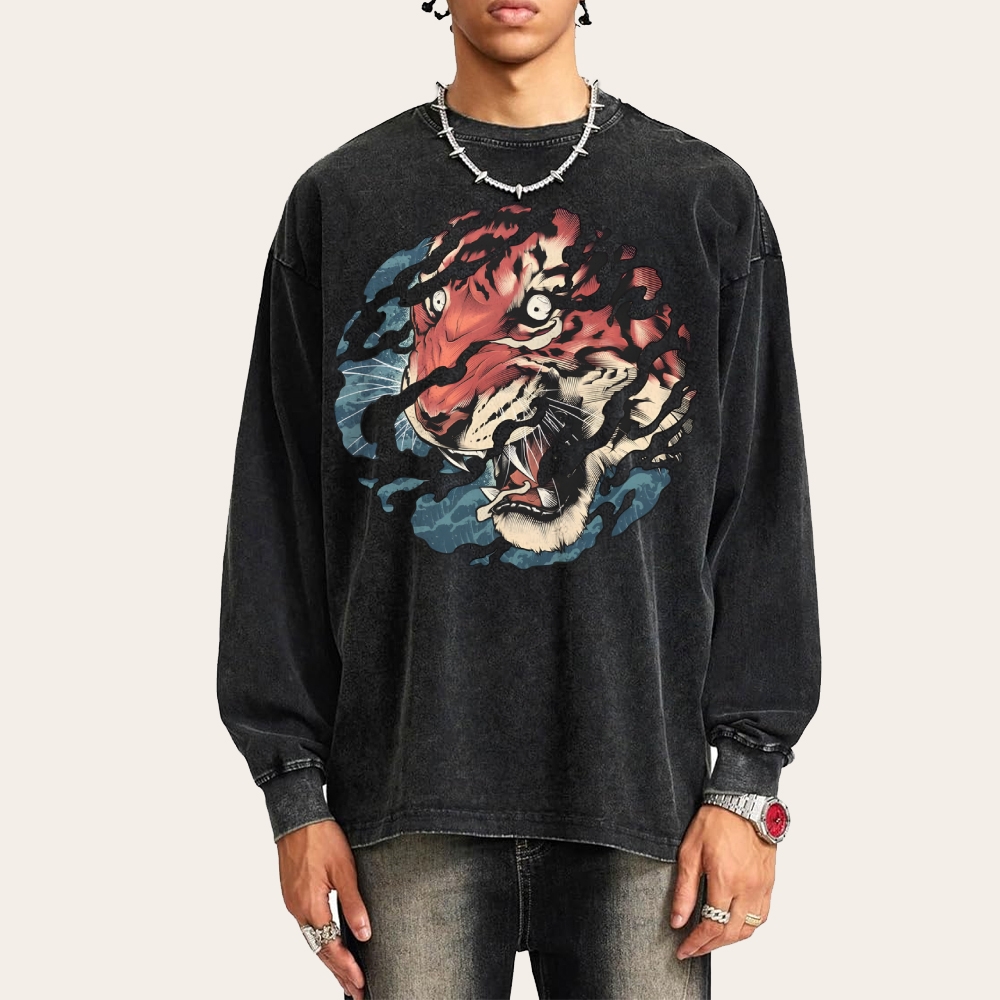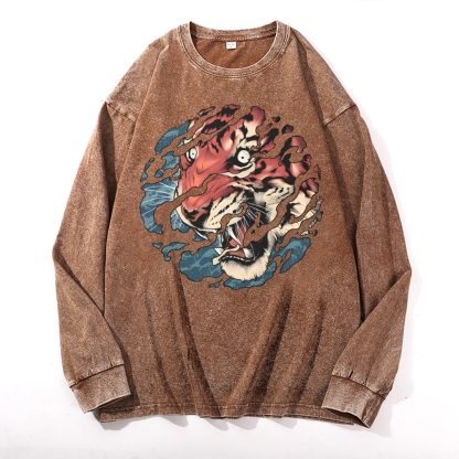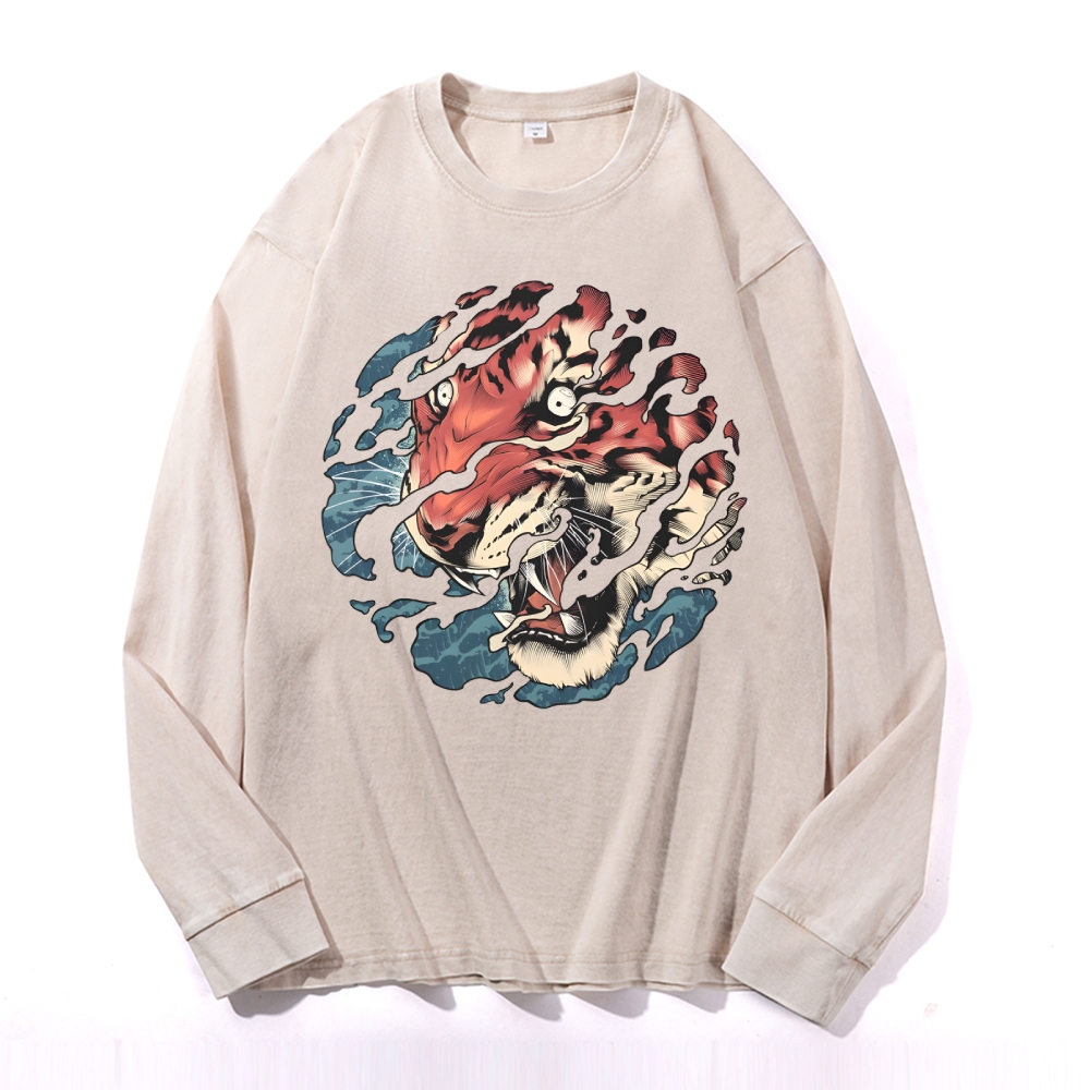 Ukiyoe Tiger Pattern Deep Washed Vintage Long Sleeves T-Shirt