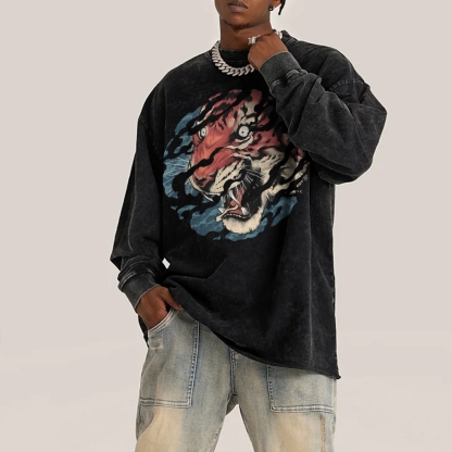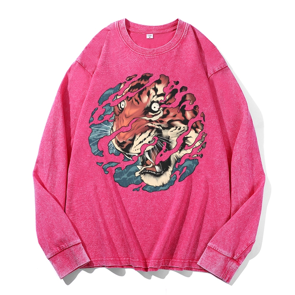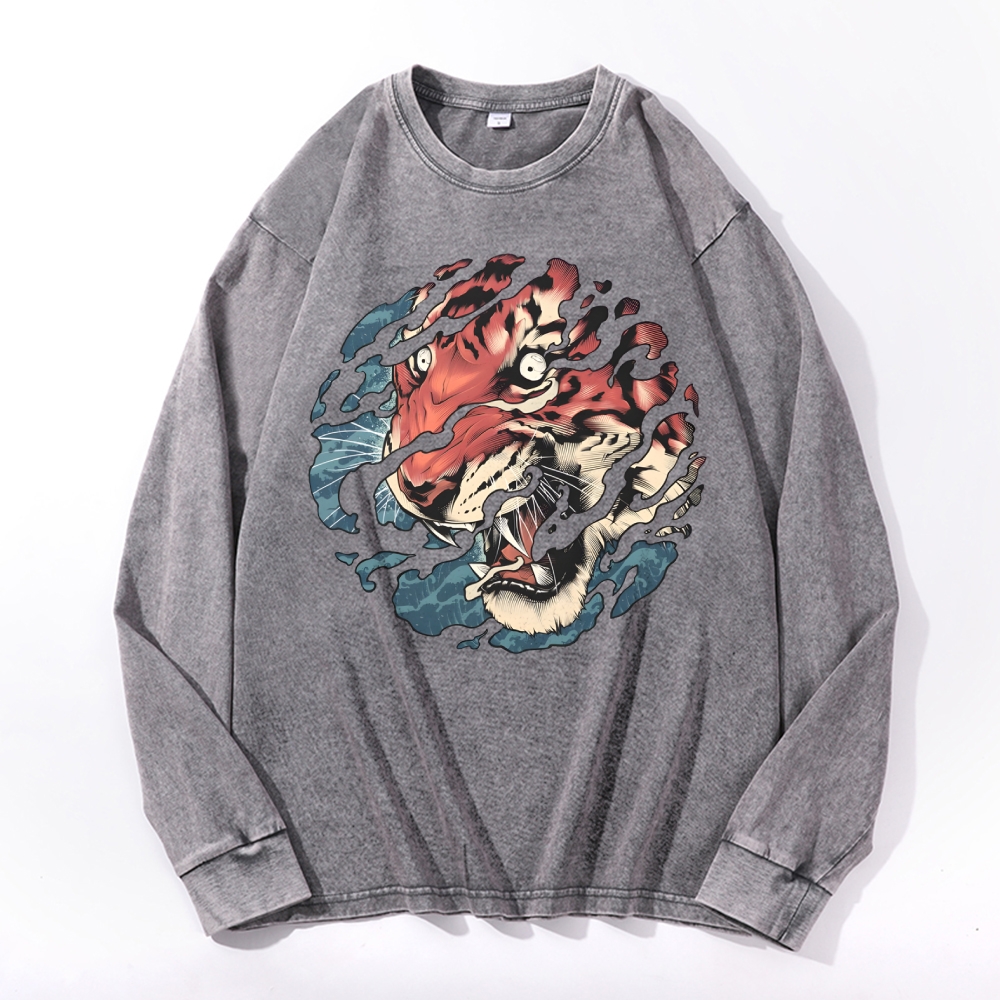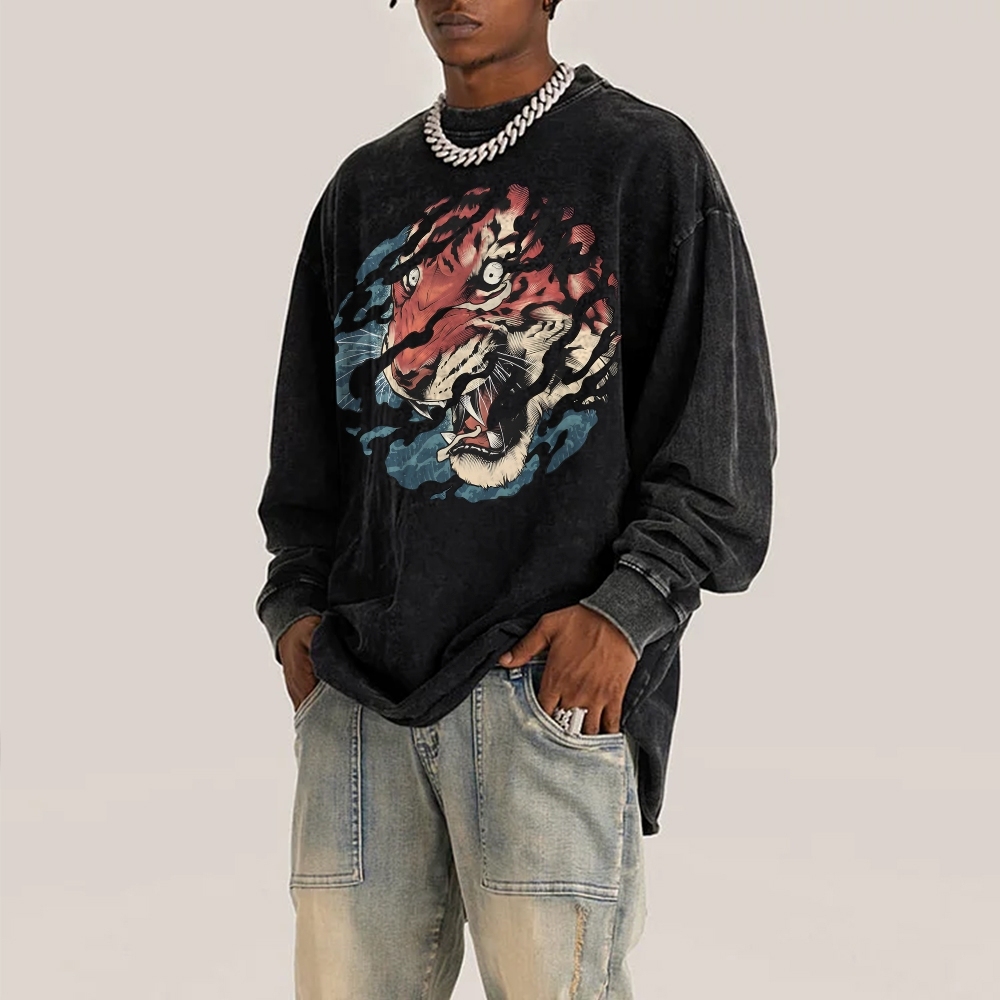 Ukiyoe Tiger Pattern Deep Washed Vintage Long Sleeves T-Shirt