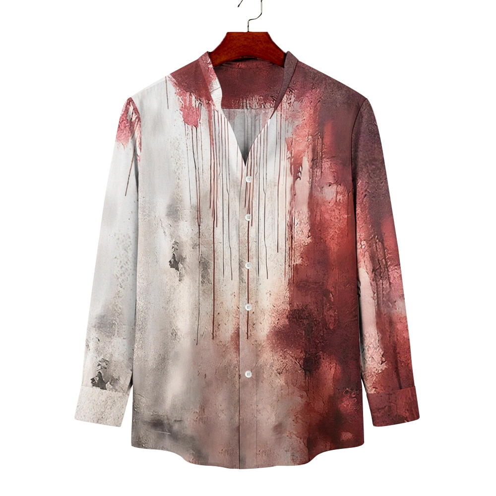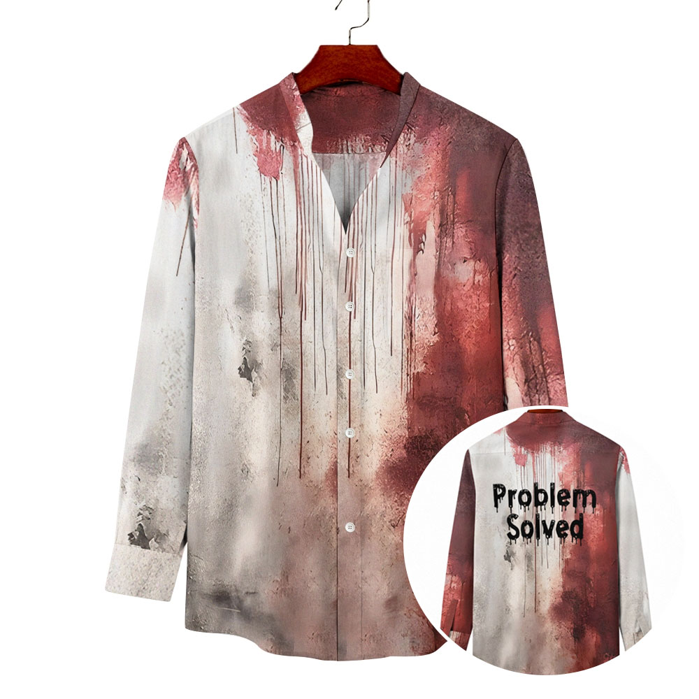 Unisex Fit Vintage Bloody Problem Solved Halloween Prints Long Sleeves Stand-Up Collar Shirt (With Pockets)