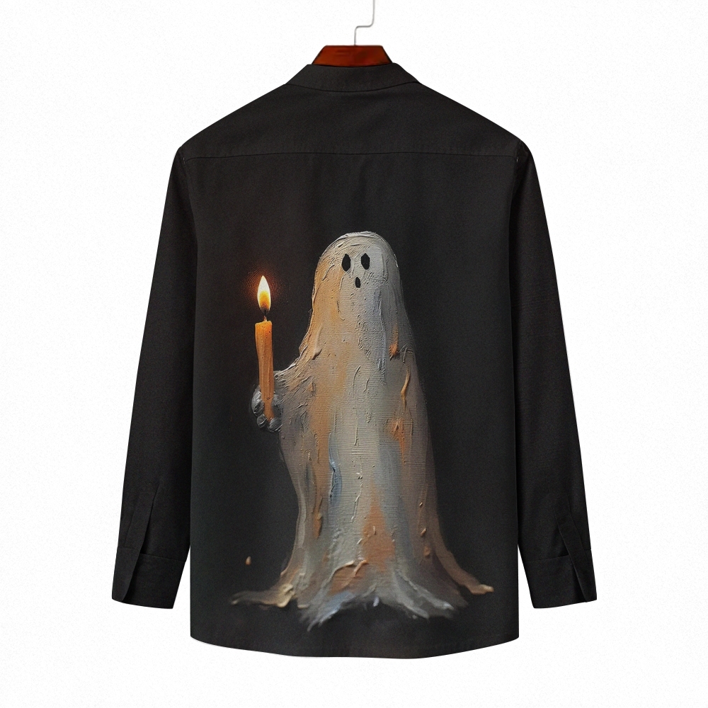 Unisex Fit Vintage Cute Ghost Halloween Prints Long Sleeves Stand-Up Collar Shirt (With Pockets)