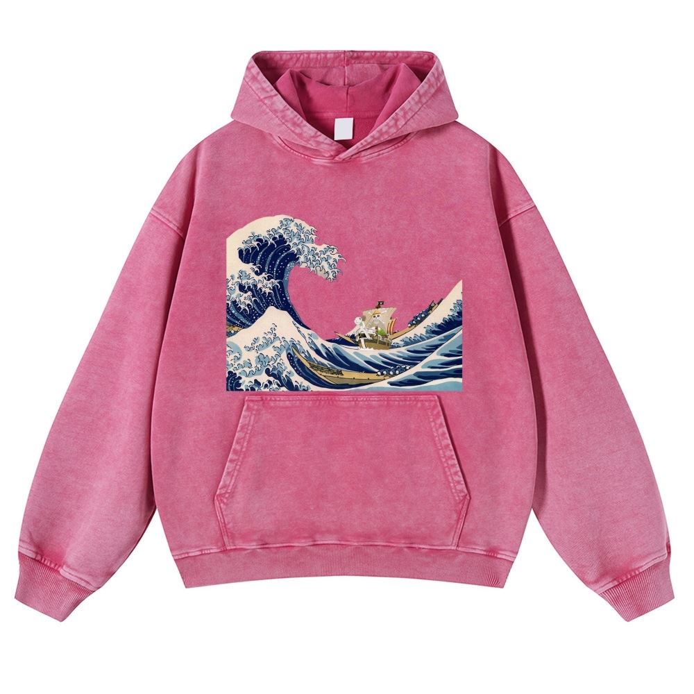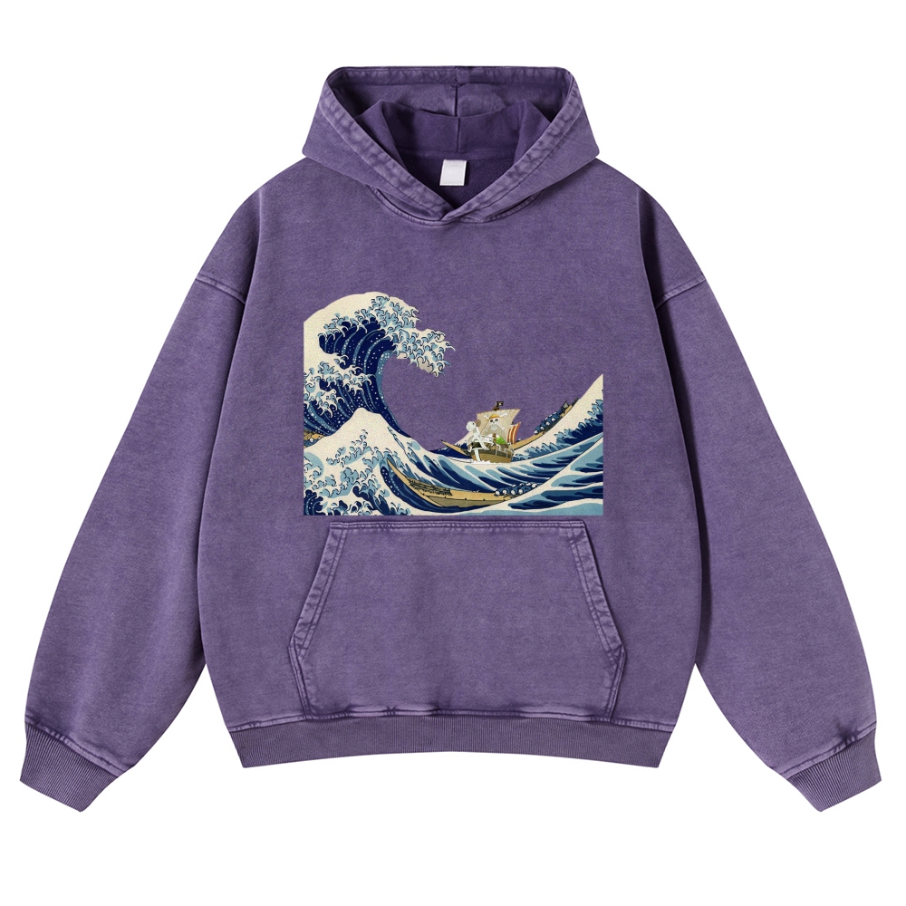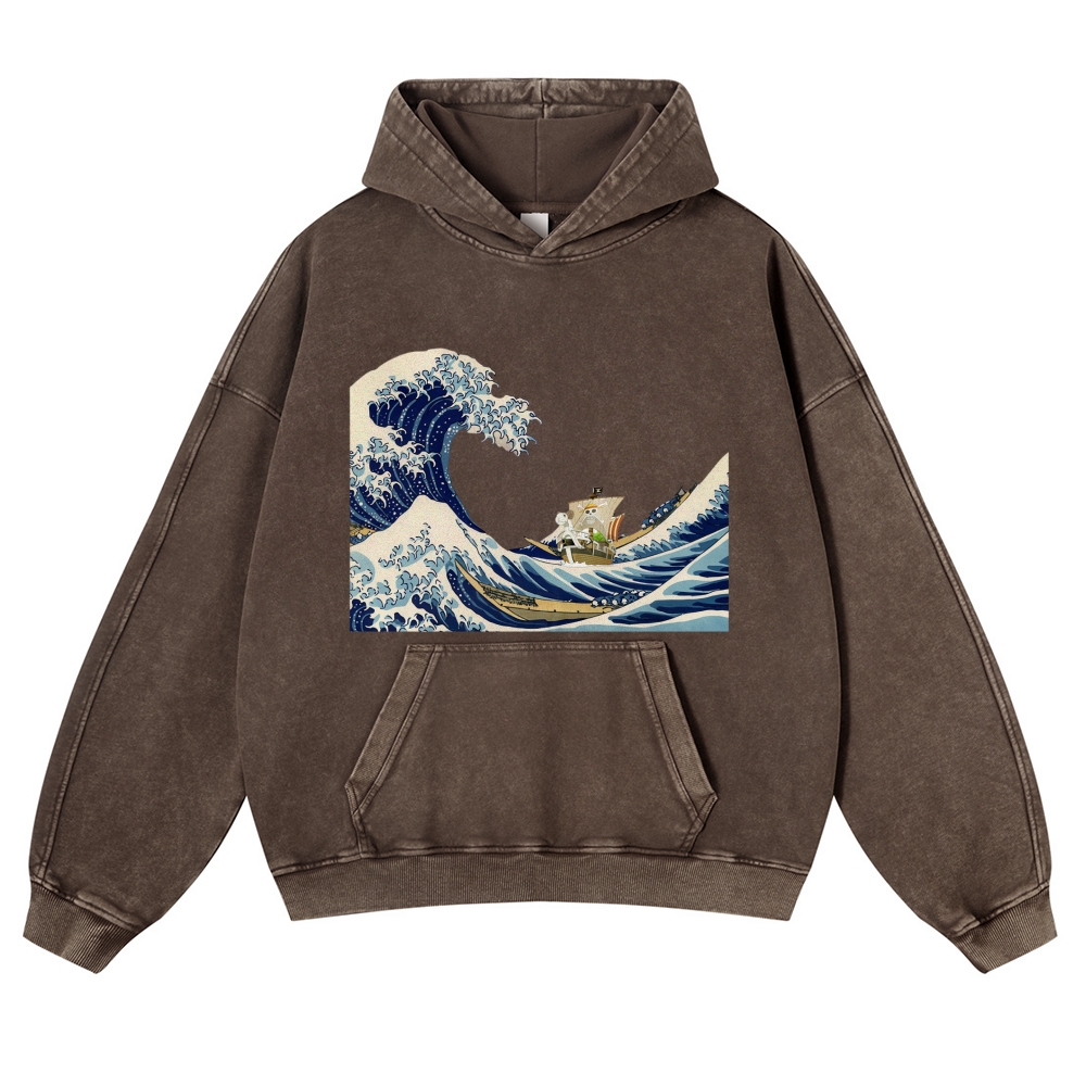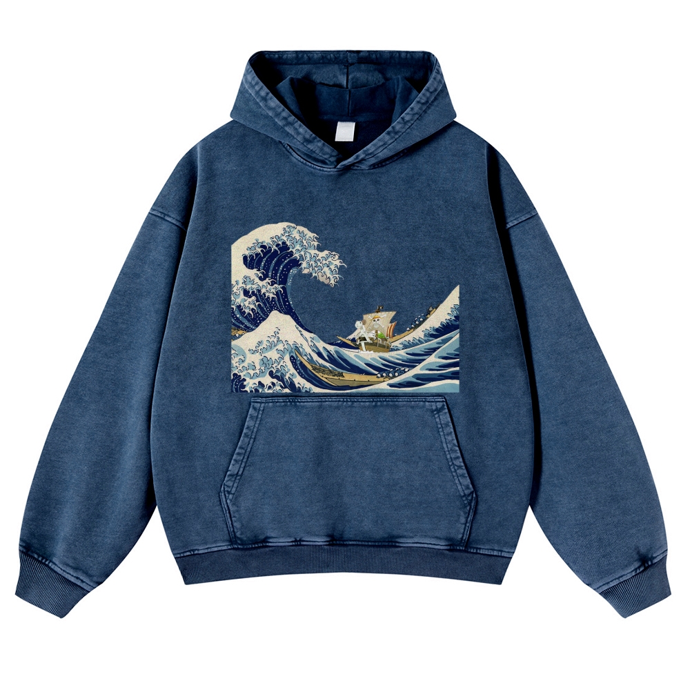 Wave Ukiyoe Pattern Vintage Washed Hoodie