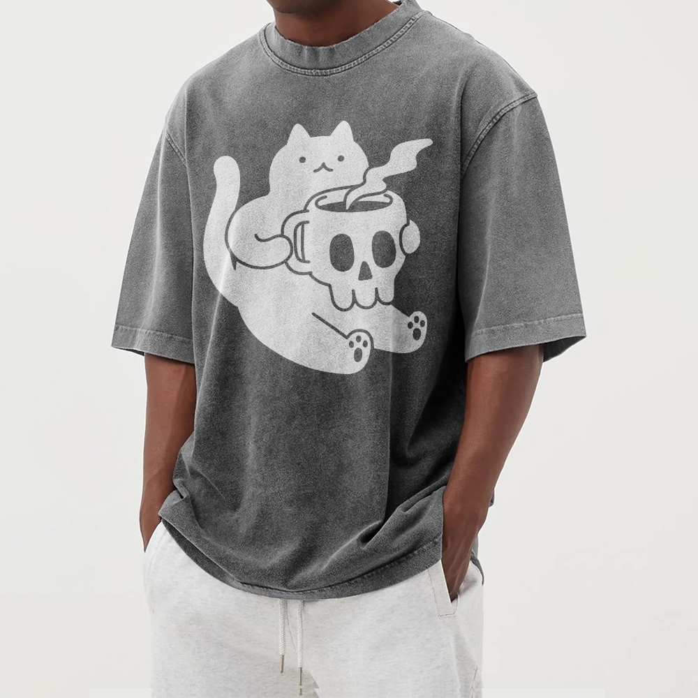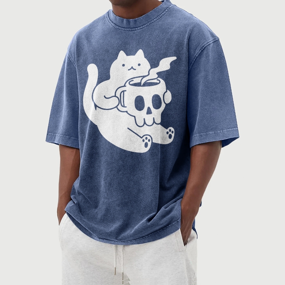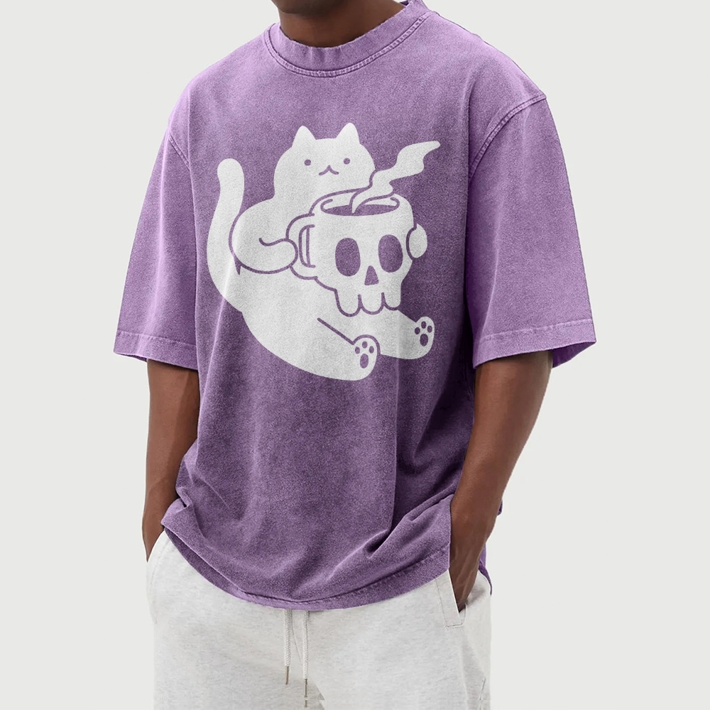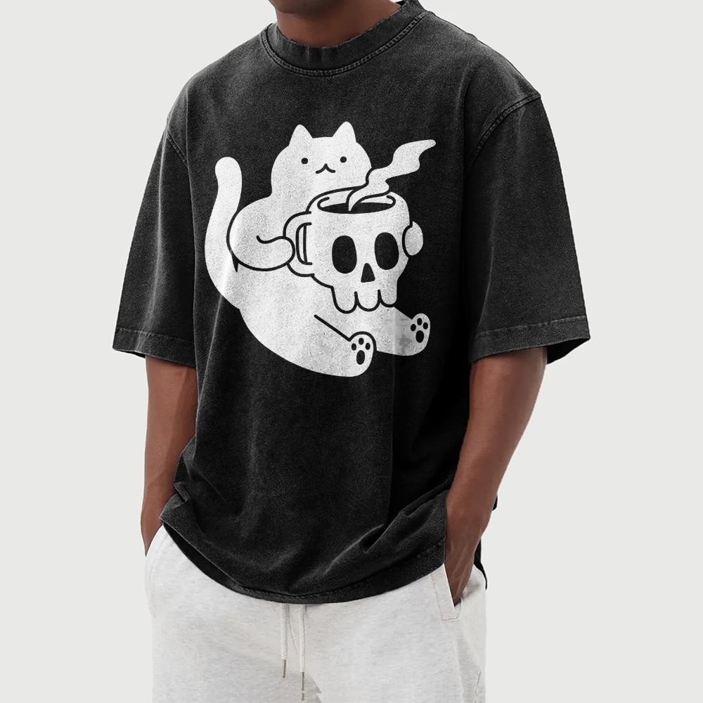 White Cat Coffee Pattern Washed Vintage Short Sleeves T-Shirt